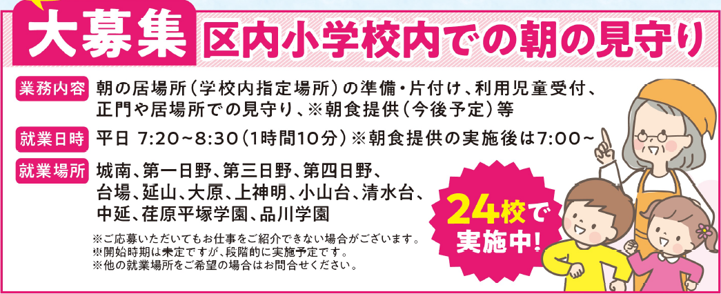 新規事業!「区内小学校内での朝の児童の居場所見守り業務」人員大募集!